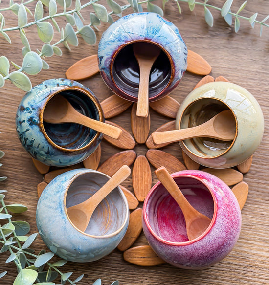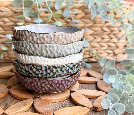 Each piece is hand 100% hand crafted from the very beginning. I use three different types of clay to achieve the finished product, all non-toxic and dinnerware safe when glazed. When you purchase a piece, you are getting quality custom craftsmanship right down to every carved notch, every brushstroke, and every last detail. My hope is to share something beautiful with you all.